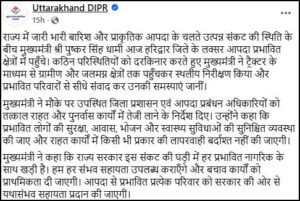 लक्सर हरिद्वार के गाँवों में पहुँचकर मुख्यमंत्री ने जलभराव, क्षतिग्रस्त सड़कें, टूटे हुए पुल और जल से घिरे घरों का निरीक्षण किया। उन्होंने आपदा प्रभावित परिवारों से बातचीत कर उनकी ज़रूरतों की जानकारी ली और भरोसा दिलाया कि राहत कार्यों में कोई कमी नहीं छोड़ी जाएगी।