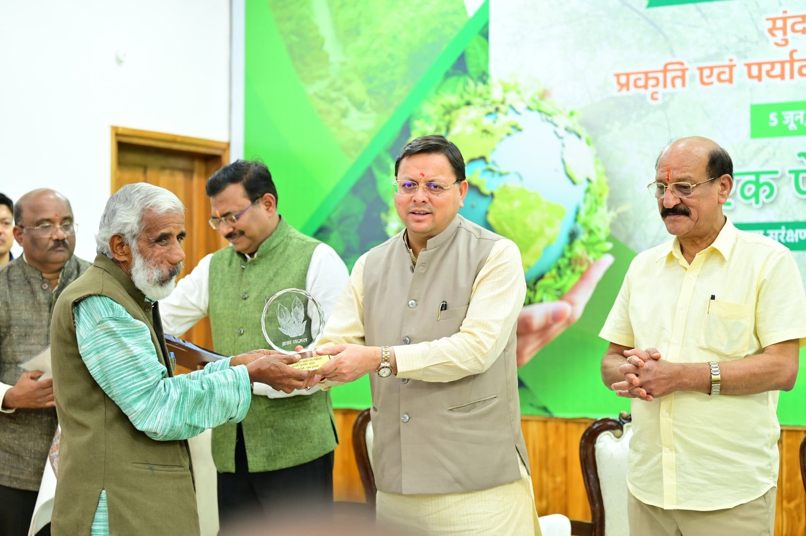 देहरादून: मुख्यमंत्री श्री पुष्कर सिंह धामी ने बुधवार को मुख्यमंत्री आवास स्थित मुख्य सेवक सदन में आयोजित कार्यक्रम में विश्व पर्यावरण दिवस 2025 के अवसर पर पर्यावरण संरक्षण में योगदान देने वाले संस्थानों और व्यक्तियों को सम्मानित किया।