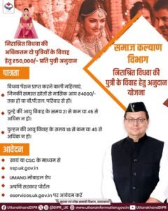 देहरादून: उत्तराखंड सरकार ने समाज के कमजोर वर्गों को सहारा देने की दिशा में एक महत्वपूर्ण कदम उठाया है। अब राज्य की निराश्रित विधवा महिलाओं को उनकी अधिकतम दो पुत्रियों के विवाह के लिए प्रति पुत्री ₹50,000 का अनुदान दिया जाएगा। यह योजना सामाजिक सुरक्षा और महिला सशक्तिकरण को मजबूती देने के उद्देश्य से चलाई जा रही है।
