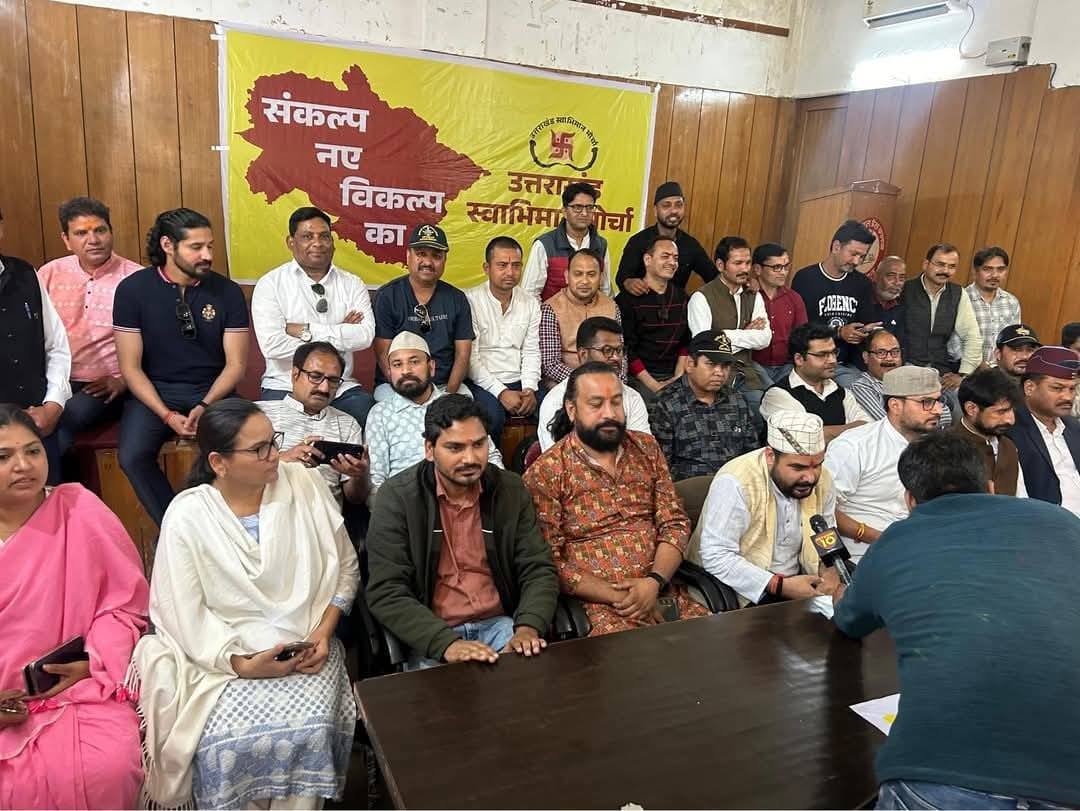 आपको बता दें कि मूल निवास उत्तराखंड बेरोजगार संघ के अध्यक्ष बॉबी पंवार, भू-कानून संघर्ष समिति के संयोजक मोहित डिमरी, केदारनाथ विधानसभा उपचुनाव में प्रत्याशी रहे त्रिभुवन सिंह चौहान एवं नगर निगम ऋषिकेश में मेयर प्रत्याशी रहे दिनेश चन्द्र “मास्टर” जी ने सामूहिक रूप से प्रेसवार्ता को संबोधित करते हुए उत्तराखंड में नए राजनीतिक विकल्प की परिकल्पना के लिए “उत्तराखंड स्वाभिमान मोर्चा” का गठन किया है। गठन के पश्चात बॉबी पंवार ने प्रेस को संबोधित करते हुए कहा कि राष्ट्रीय दलों की सरकारों द्वारा उत्तराखंड में विगत 25 वर्षों से जो विकास होना चाहिए था वह आज भी धरातल पर नहीं हो पाया है तथा क्षेत्रीय शक्तियां अलग-अलग गुटों में बंटकर रह गई हैं।